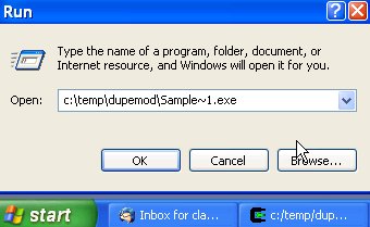 the process maps both c:\temp\dupemod\Sample~1.exe and